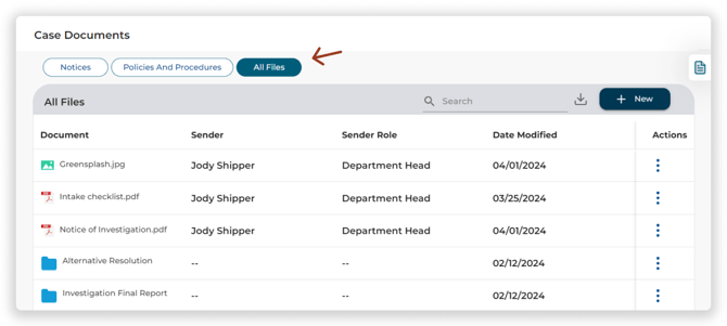 On the Case Documents screen, click the All Files tab at the top of the screen.
