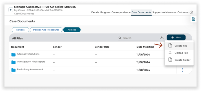 Note: Only users with certain permissions can create case documents. Learn more about user roles and permissions, or contact your Administrator to request access to create case documents.