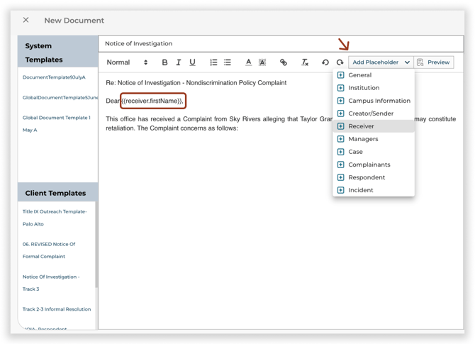 You can insert personalized or dynamic content into your document using placeholder tags. When you insert a placeholder tag into your document, it will be replaced with the corresponding data stored in Case Tracker.