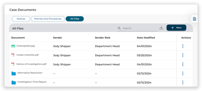To upload a new case file, navigate to the All Files tab, then click + New button in the upper right corner of the All Files table. If you want to save a file(s) into a particular folder or sub folder, first open that folder. Next, click + New button in the upper right corner of the All Files table.