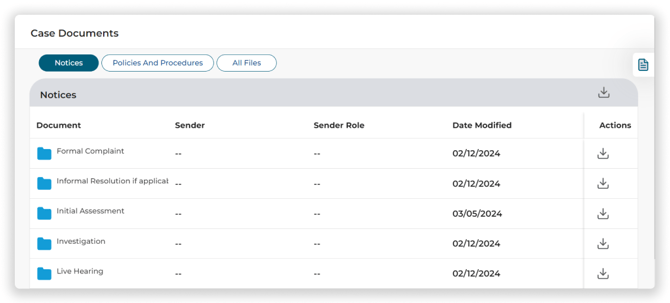 - Notices: Any documents that were attached to correspondence sent throughout the case and had the 'Copy to Notices' box checked will appear under the Notices Tab and in the corresponding step folder.