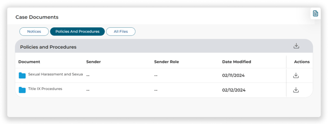- Policy and Procedure: Policy documents will automatically appear under the Policies and Procedures Tab based on the policy that was selected when the case was created.