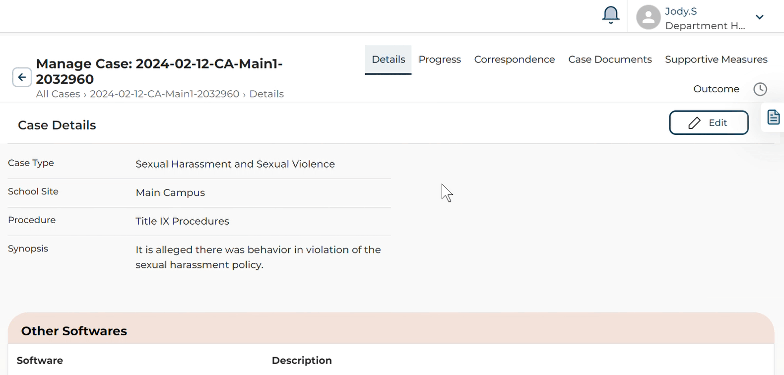 To view and edit the incidents, synopsis, party details, and case managers, click the Details Tab on the Top Navigation Menu.