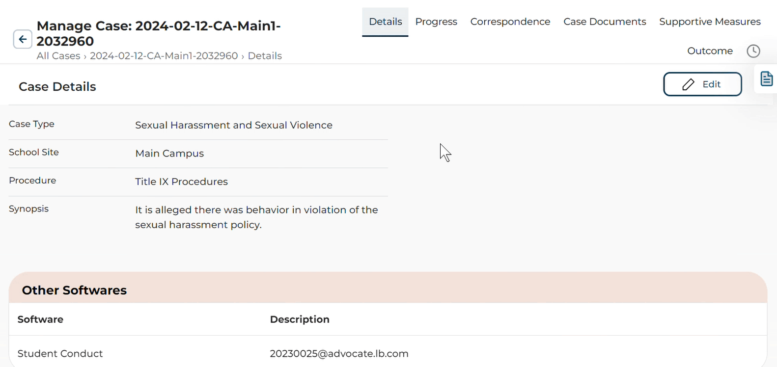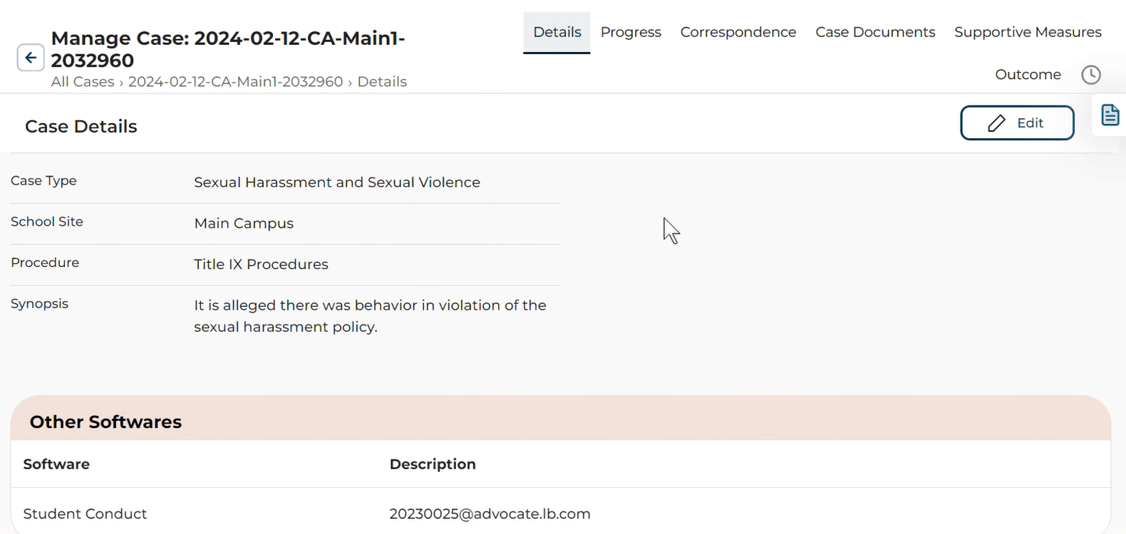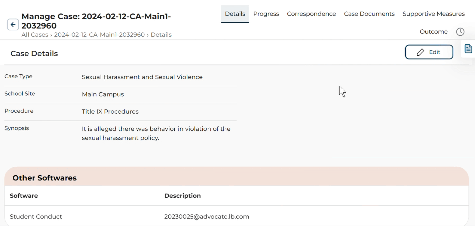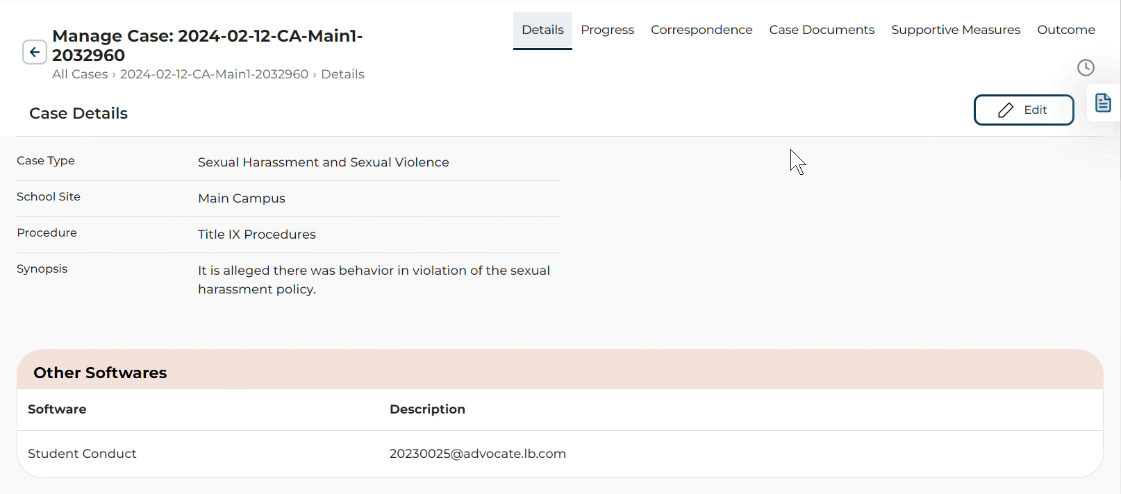 View and manage case details, status, supportive measures, correspondence, case documents, and outcomes.
