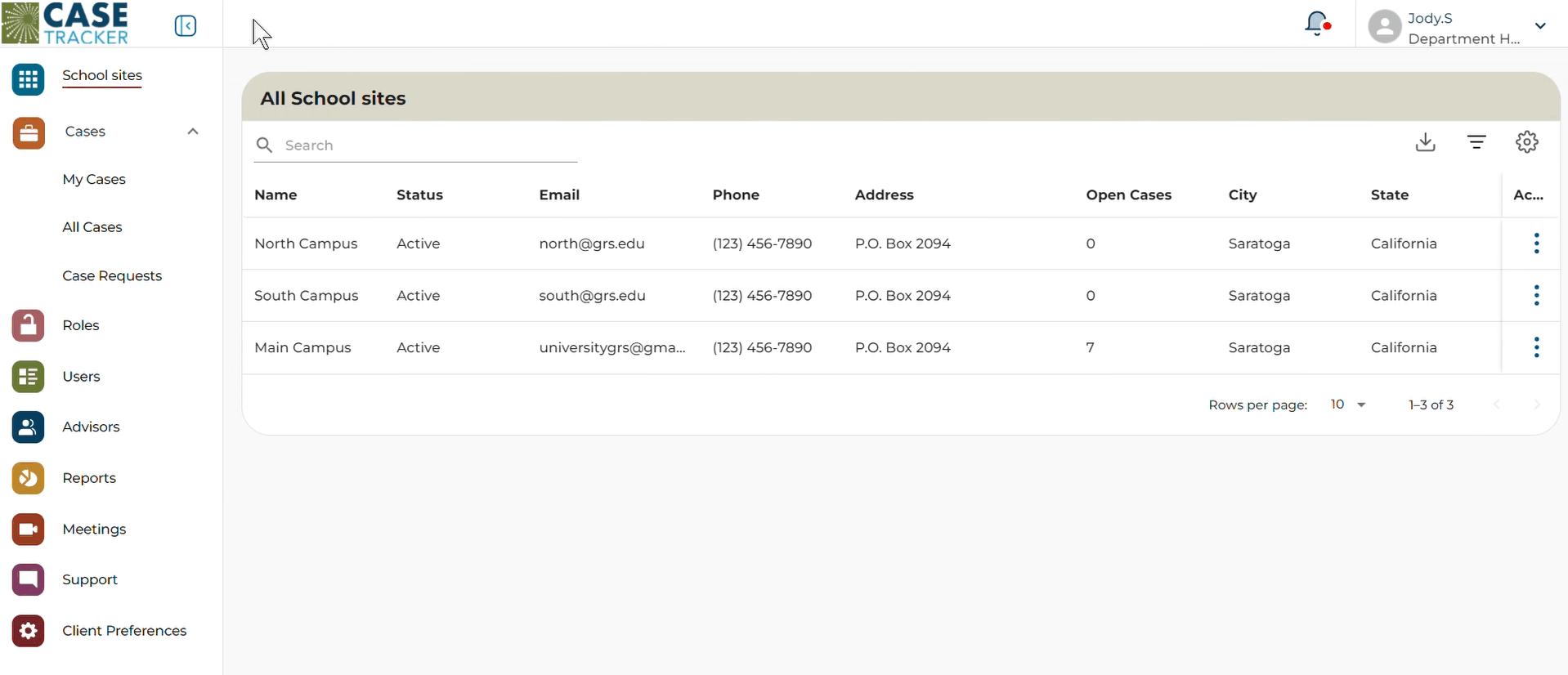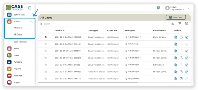To view all cases in a table view, click on the Cases Tab on the Left Navigation Menu.