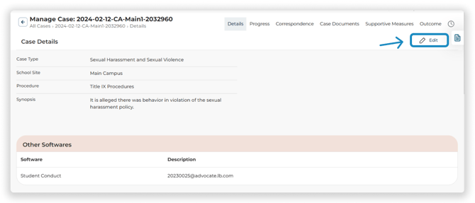 Click the Edit Button at the top right of the screen to edit or add new details to the case. You must also Edit the case to view the incident description text. ![]()
