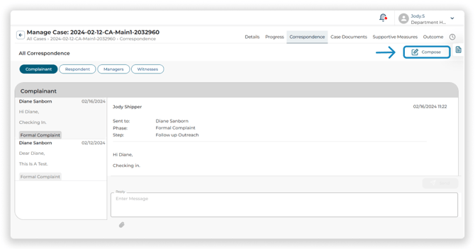 To view and send correspondence to parties, witnesses, and case managers, click the Correspondence Tab on the Top Navigation Menu.