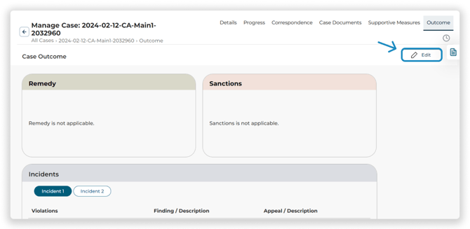To view, document, and edit the outcome of each incident and violation associated with the case, click the Outcome Tab on the Top Navigation Menu. ![]()
