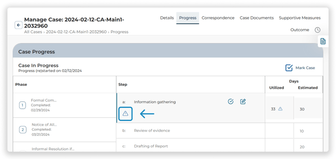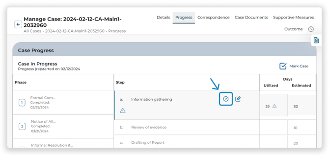 Click the Update Case Progress Icon to the right of the step to mark the step as complete or to pause the step and revert back to a previous step.