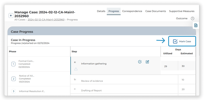 To view and edit the status of the case and which steps have been completed, click the Progress Tab on the Top Navigation Menu.