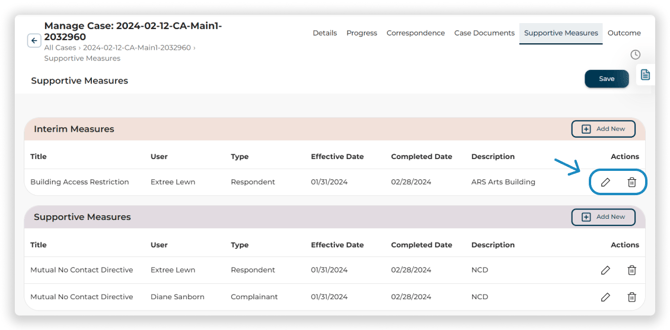 To view and document interim measures, supportive measures, and accommodations that are associated with a case, click the Supportive Measures Tab on the Top Navigation Menu. ![]()